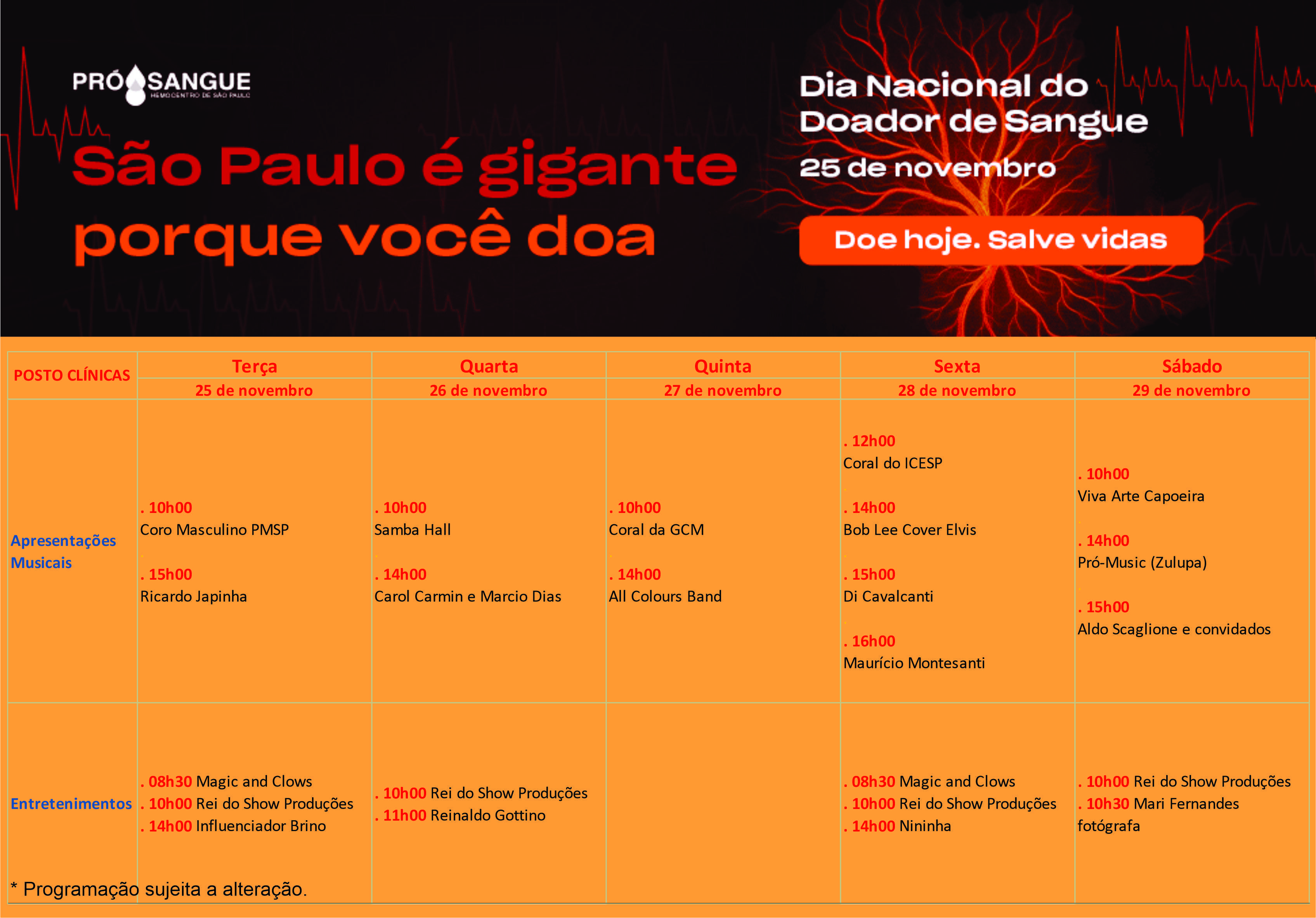 No posto Clínicas, o público poderá acompanhar apresentações do Grupo Pró Music — formado pelo músico e doador Zulupa —, dos mágicos e palhaços do Magic & Clowns, do Coro Masculino da Polícia Militar do Estado de São Paulo, do Coral da Guarda Civil Metropolitana, do Coral do ICESP, além da participação de personagens surpresa do parceiro Rei do Show Produções e da palhaça Nininha. Também marcam presença o músico e influenciador Ricardo Japinha, a Associação Viva Arte Capoeira, o músico e doador de sangue Aldo Scaglione; a dupla Carol Carmin & Marcio Dias; a All Colours Band com seu jazz; o Samba Hall com muita energia; Bob Lee interpretando Elvis Presley; Di Cavalcanti no sertanejo; e Mauricio Montesanti com sua guitarra, estreando um apoio juvenil à causa. A edição deste ano também contará com a presença de celebridades e influenciadores, como os atores Suzy Rêgo e Fernando Vieira, o jornalista Reinaldo Gottino, a fotógrafa Mari Fernandes e o influenciador Brino, que se unem à causa para reforçar a importância da doação de sangue.